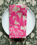 Cool California poppies with an early-70s-meets-Art-Nouveau vibe, in a khaki on natural unbleached linen.