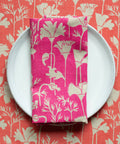 Cool California poppies with an early-70s-meets-Art-Nouveau vibe, in a tomato soup red on natural unbleached linen.