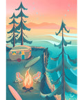 Enjoy a gorgeous pastel-coloured sunset overlooking the ocean. Beautifully-illustrated travel poster puzzle of a cozy camping trailer perched on a cliff above the peaceful ocean below, designed by Vancouver Island artist Capri Sadler.