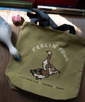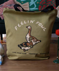 SHC's fowl duo duck & goose are printed in 3 colours of premium water-based ink on the front of this olive green tote with black canvas straps.