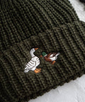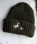 - 100% acrylic knit in pine green with "Fowl" duck & goose design embroidered onto the rolled edge