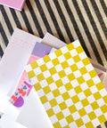 A small notepad in a beautiful golden-yellow checkerboard for list-making and other thoughts.