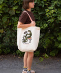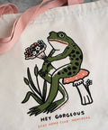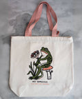 SHC's generous frog friend is screen printed in premium water-based ink on the front of this tote in natural canvas with bubblegum pink straps.