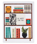 This interactive card has little book on the shelf that opens up to read "So Happy for You".