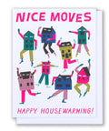A Happy Housewarming Card featuring a crazy dance party! Nice Moves, perfect for a new home or an extra special welcome to the neighbourhood.