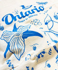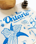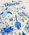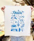 Ontario - Yours to Discover! This beautiful hand-printed tea towel features illustrations of a loon, trillium, vine tomatoes, the CN Tower, and more.