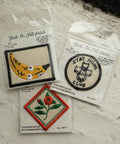 - 2" x 2" vintage-inspired felt patch with embroidered detail and merrowed border