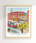 This is a print of an original gouache painting of Toronto's King Street during the fall season.