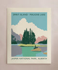 Original illustration of Spirit Island on Maligne Lake in Alberta's Jasper National Park. Inspired by mid-century vintage travel poster advertisements.