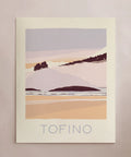Original illustration of Tofino's Chesterman Beach at sunrise when the sun slowly kisses the morning fog. Inspired by mid-century vintage travel poster advertisements.