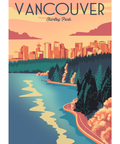 Enjoy a sunset on the Stanley Park seawall in Vancouver, BC - free from all the tourists, bikes, and scooters. Beautifully-illustrated travel poster puzzle of the city skyline at sunset, designed by Vancouver Island artist Capri Sadler.