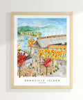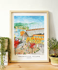 This is a print of an original gouache painting of Vancouver's Granville Island in the fall season.