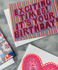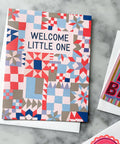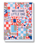 A beautiful vintage quilt in warm pinks and red and blues with a special greeting for a new baby, Welcome Little One. A beautiful card for the new arrival and their proud parents.